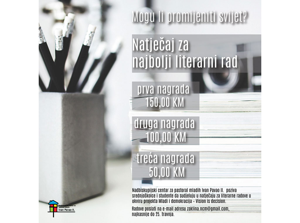 Nadbiskupijski centar za pastoral mladih Ivan Pavao II. poziva srednjoškolce i studente na sudjelovanje u natječaju za literarne radove u sklopu projekta "Mladi i demokracija – Vision is decision".