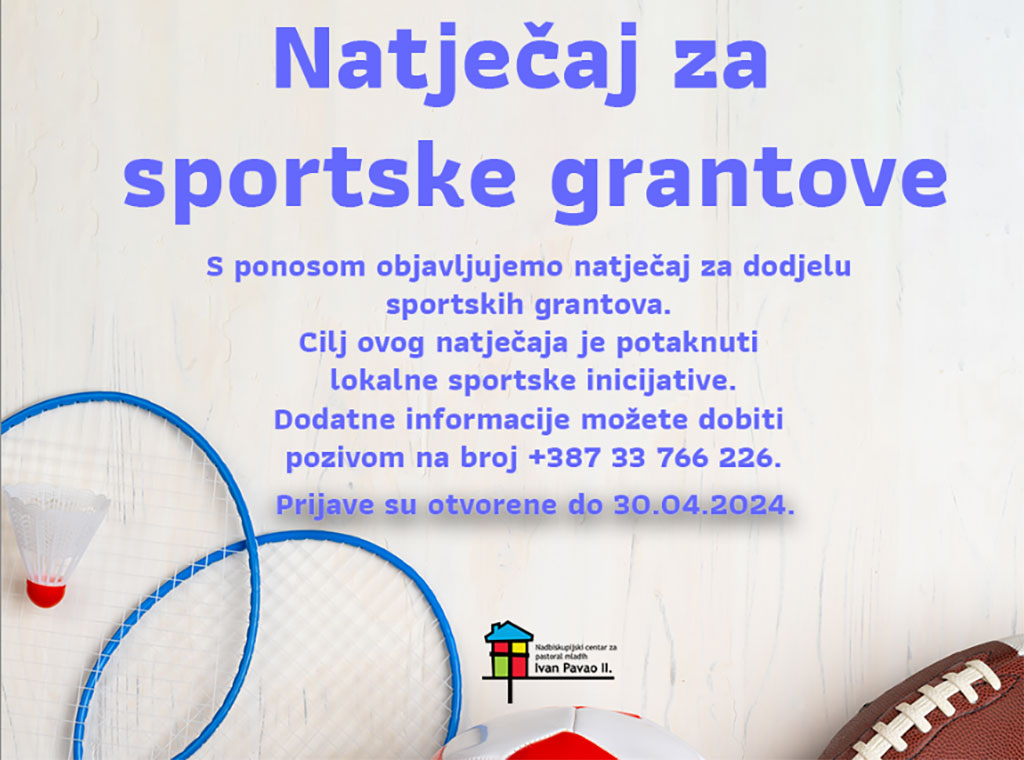 Cilj ovog natječaja je potaknuti lokalne sportske inicijative, a otvoren je za sportske klubove, udruge, škole, župe, (ne)formalne skupine mladih u župama Vrhbosanske nadbiskupije, koji se bave organizacijom sportskih događanja i promicanjem sportskih vrijednosti, međukulturalne suradnje i dijaloga. Vrijednost granta iznosi između 1 000 i 1 500 KM, a odobreni iznos potrebno je utrošiti za organizaciju sportskih događanja u kojima će sudjelovati mladi.