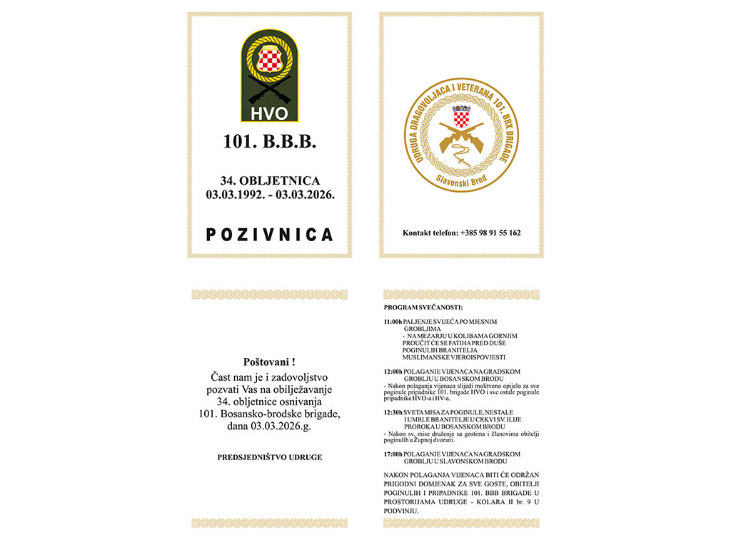 Udruga dragovoljaca i veterana 101. Bosanskobrodske brigade obilježit će, u utorak, 3. ožujka, 34. obljetnicu osnivanja 101. Bosanskobrodske brigade Hrvatskog vijeća obrane (BBB), prve postrojbe u BiH koja je pružila aktivan otpor tadašnjem neprijatelju.