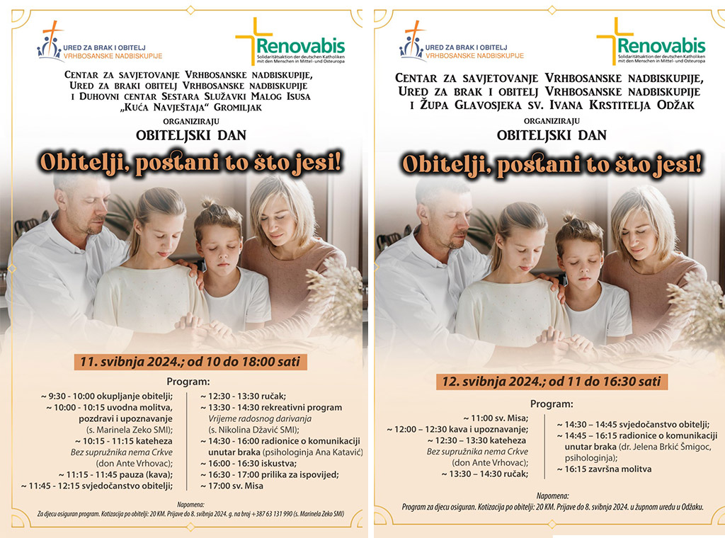 Ured za brak i obitelj i Centar za savjetovanje Vrhbosanske nadbiskupije u svibnju organiziraju dva obiteljska dana pod nazivom "Obitelji, postani to što jesi!".