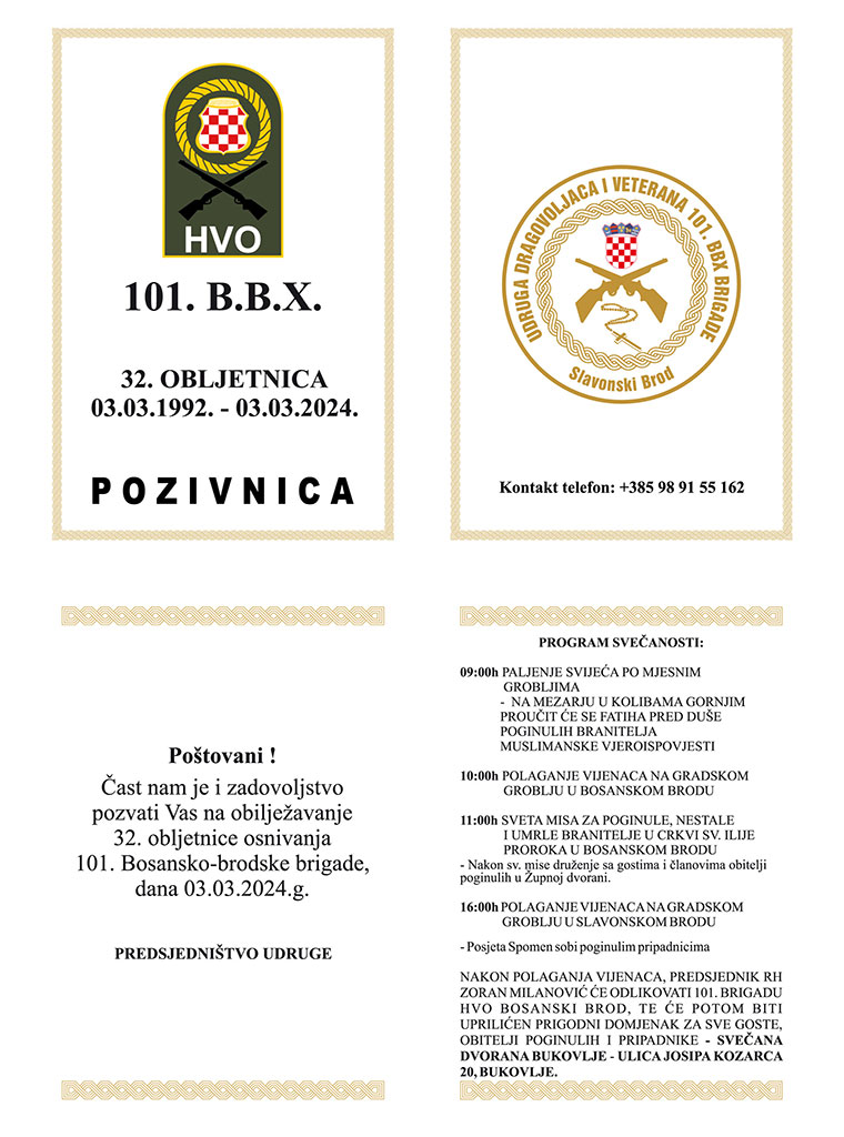 Udruga dragovoljaca i veterana Domovinskog rata H-B podružnica u Brodu u zajedništvu sa zajednicom podružnica u Županiji Posavskoj obilježit će u nedjelju 3. ožujka 32. obljetnicu osnivanja 101. Bosanskobrodske brigade (BBB) HVO.