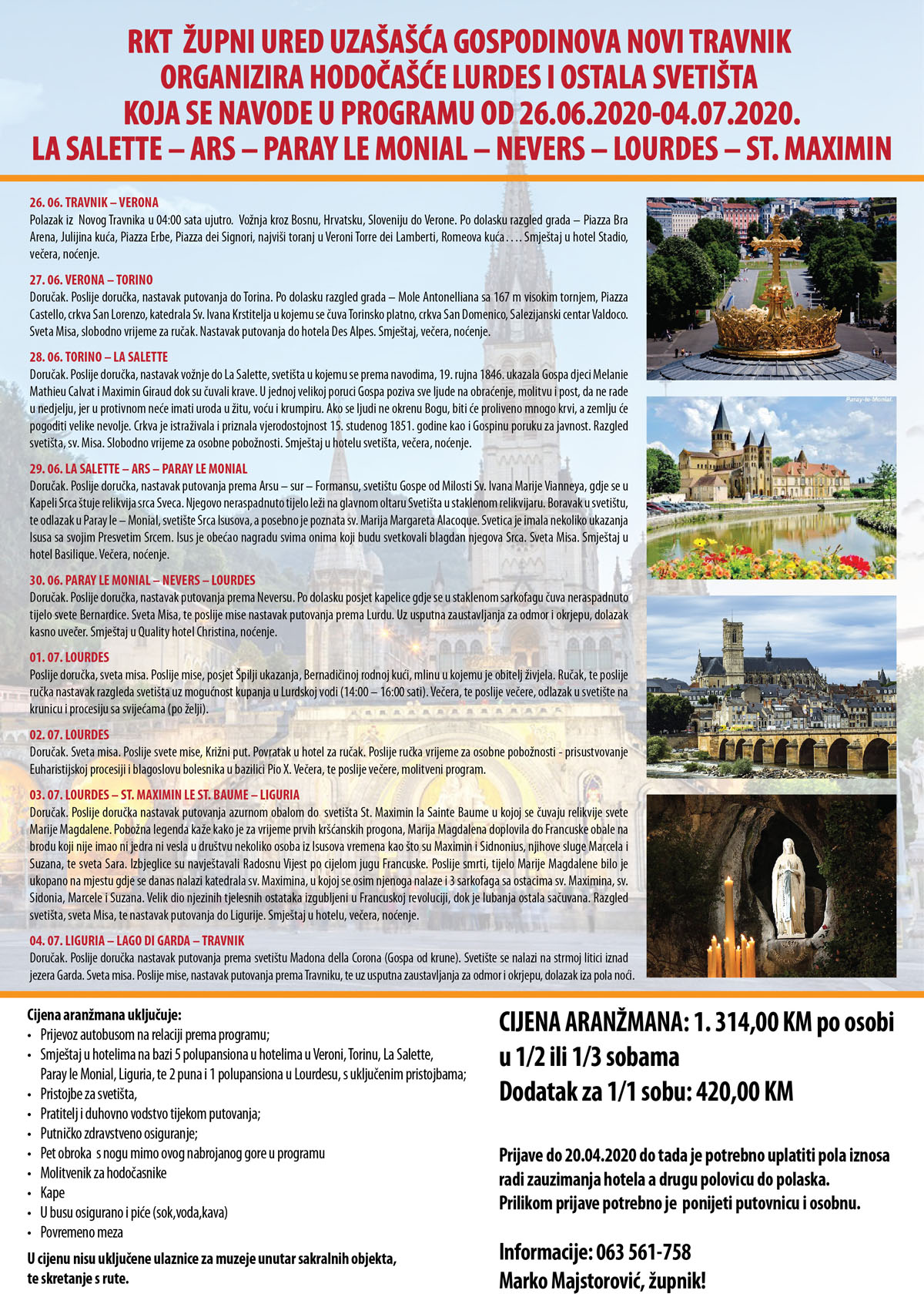 Župni ured Uzašašća Gospodinova Novi Travnik organizira od 26. lipnja do 4. srpnja hodočašće u Lurd i druga svetišta navedena u programu.