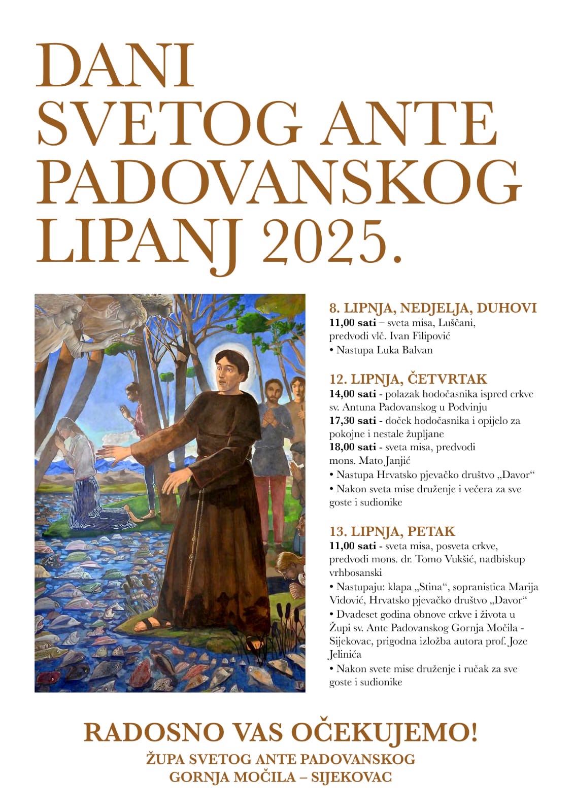 Dani Sv. Ante Padovanskog u spomenutoj župi započinju na svetkovinu Duhova, 8. lipnja kada će sv. misu predslaviti vlč. Ivan Filipović. Dan uoči patrona, 12. lipnja, u 14:00 sati je predviđen polazak hodočasnika ispred crkve Sv. Ante Padovanskog u Podvinju, a u 17:30 se očekuje njihov dolazak u bosansku Posavinu gdje će se izmoliti molitva za pokojne i nestale župljane. Misu uočnicu u 18:00 predslavit će mons. Mato Janjić, župnik u Poljacima, a nakon toga bit će upriličen nastup Hrvatskog pjevačkog društva Davor te zajedničko druženje i večera za prisutne.