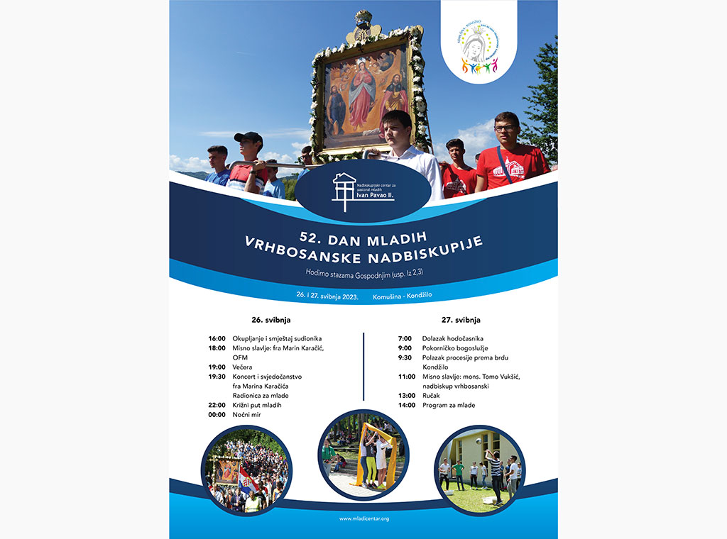 Posljednjeg vikenda u mjesecu, 26. i 27. svibnja u organizaciji Nadbiskupijskog centra za pastoral mladih Ivan Pavao II. bit će upriličen 52. po redu Dan mladih Vrhbosanske nadbiskupije pod geslom "Hodimo stazama Gospodnjim" (usp. Iz 2,3).