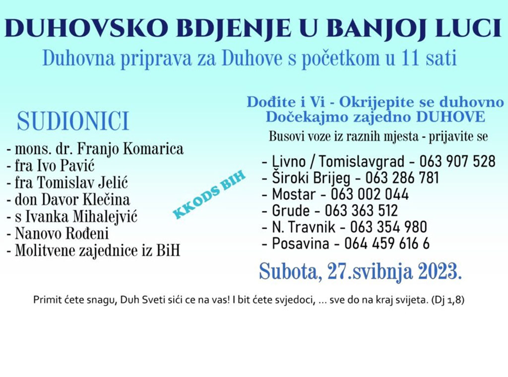 Mons. Komarica odredio je da se na tu nakanu moli Gospina krunica, litanije i druge prikladne molitve za Crkvu i za sinodu u subotu, 27. svibnja kada će u župnoj crkvi Marijina uznesenja na Nebo u župi Marija Zvijezda, u zajedništvu sa svim hodočasnicima brojnih karizmatskih grupa i drugim vjernicima slaviti Duhovsko bdjenje.