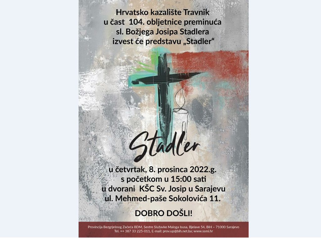 Sestre Služavke Maloga Isusa Sarajevske provincije Bezgrešnog začeća BDM-a, sa sjedištem u samostanu Egipat u Sarajevu, pozivaju na predstavu koju će izvesti Hrvatsko kazalište Travnik u čast 104. obljetnice preminuća sluge Božjega Josipa Stadlera.