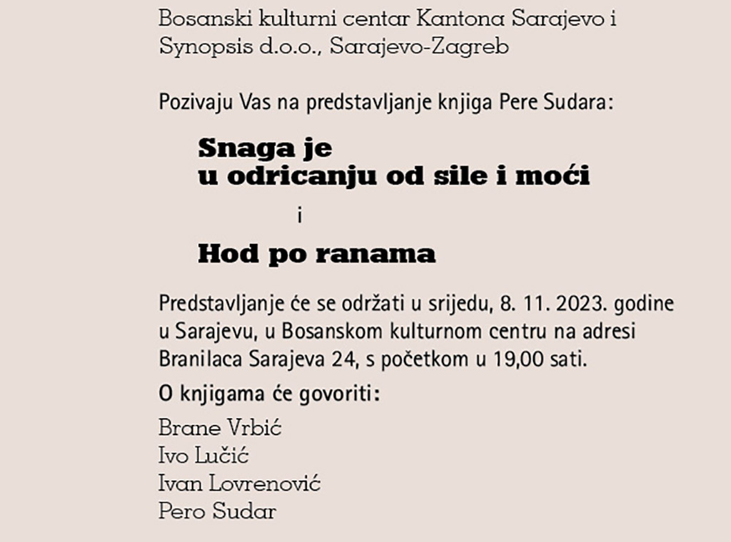 Knjige Snaga je u odricanju od sile i moći. Razgovor s Biskupom i Hod po ranama. Zapisi s obilazaka vrhbosanskih župa od 1992. do 1997. godine predstavit će Brane Vrbić, Ivo Lučić, Ivan Lovrenović i biskup Sudar.