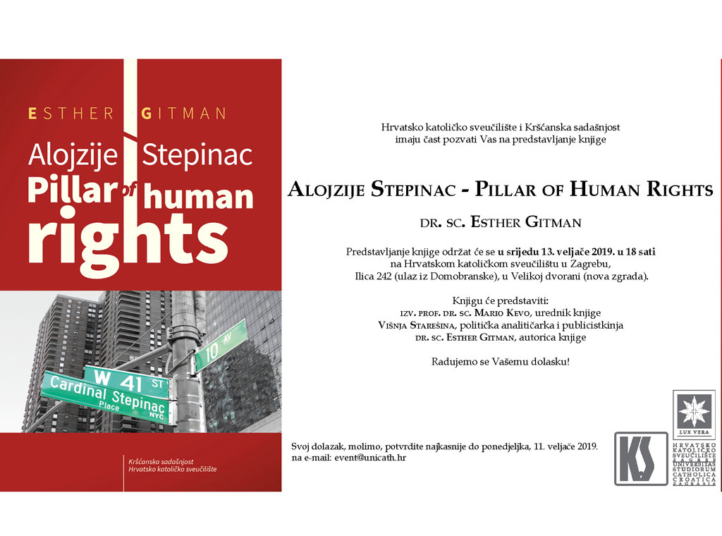 Hrvatsko katoličko sveučilište i Kršćanska sadašnjost organiziraju predstavljanje knjige dr. sc. Esther Gitman „Alojzije Stepinac-Pillar of Human Rights“ u srijedu 13. veljače u 18 sati na Hrvatskom katoličkom sveučilištu u Zagrebu.