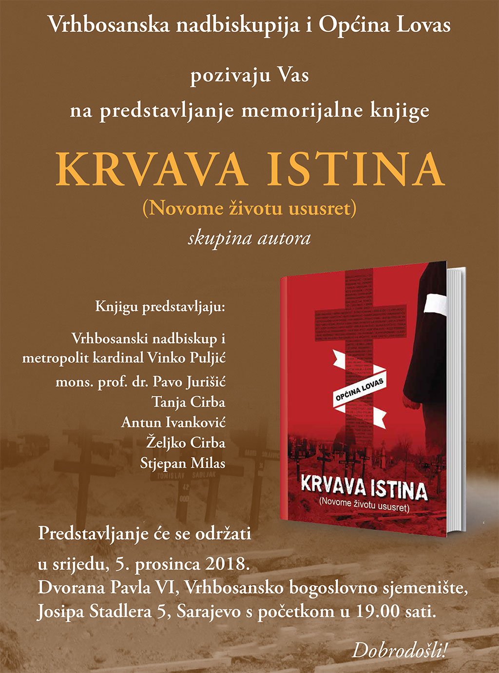 Ovu memorijalnu knjigu predstavit će nadbiskup metropolit vrhbosanski Vinko kard. Puljić, mons. prof. dr. sc. Pavo Jurišić, Tanja Criba, Antun Ivanković, Željko Cirba i Stjepan Milas.