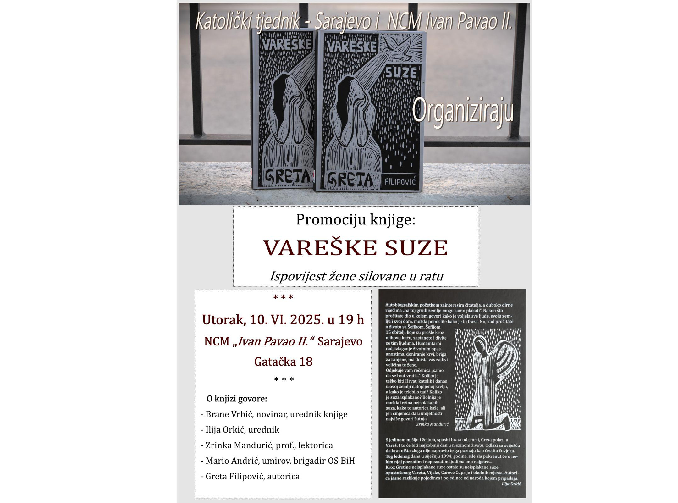 U Nadbiskupijskom centru za pastoral mladih Ivan Pavao II. u Sarajevu 10. lipnja u 19:00 h bit će upriličena promocija knjige Grete Filipović Vareške suze.