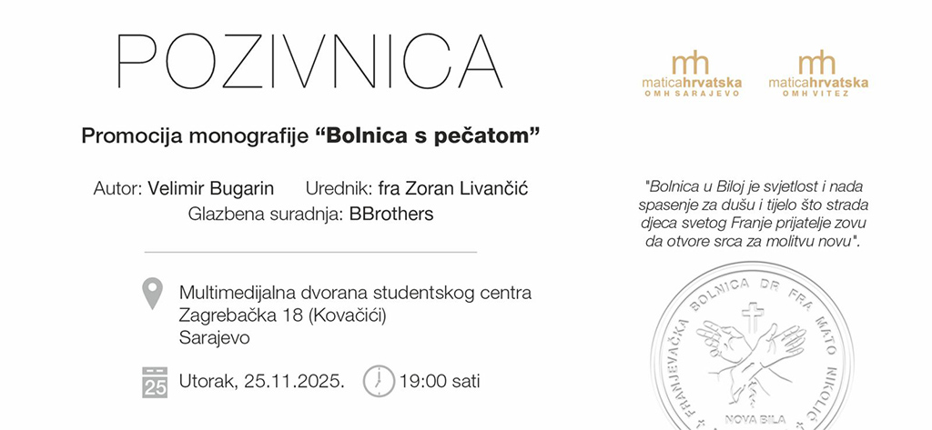 Predstavljanje monografije „Bolnica s pečatom“, koja na svojim stranicama prikazuje ratno razdoblje Franjevačke bolnice „Dr. fra Mato Nikolić“ u Novoj Biloj, bit će u utorak, 25. studenoga, u 19:00 h u Multimedijalnoj dvorani studentskog centra na Kovačićima u Sarajevu.