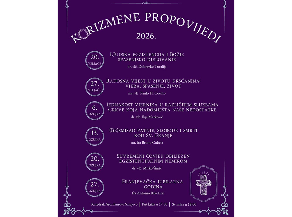 Korizmene propovijedi ove godine započinju 20. veljače s početkom u 18 sati u sarajevskoj katedrali Srca Isusova.