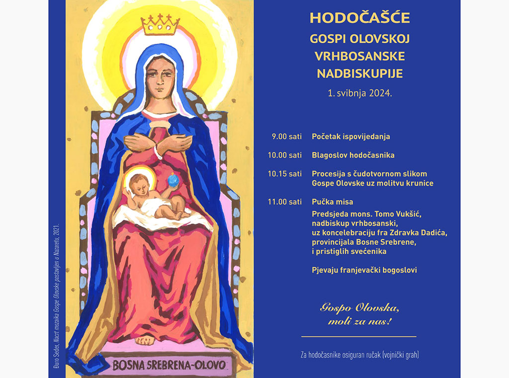 Program započinje već od 9 sati kada će biti prilika za svetu ispovijed. Potom u 10 sati slijedi blagoslov hodočasnika, a zatim odmah procesija s čudotvornom slikom Gospe Olovske uz molitvu krunice. U 11 sati nadbiskup vrhbosanski metropolita mons. Tomo Vukšić slavit će svečanu koncelebriranu svetu misu, objavljeno je na bosnasrebrena.ba.