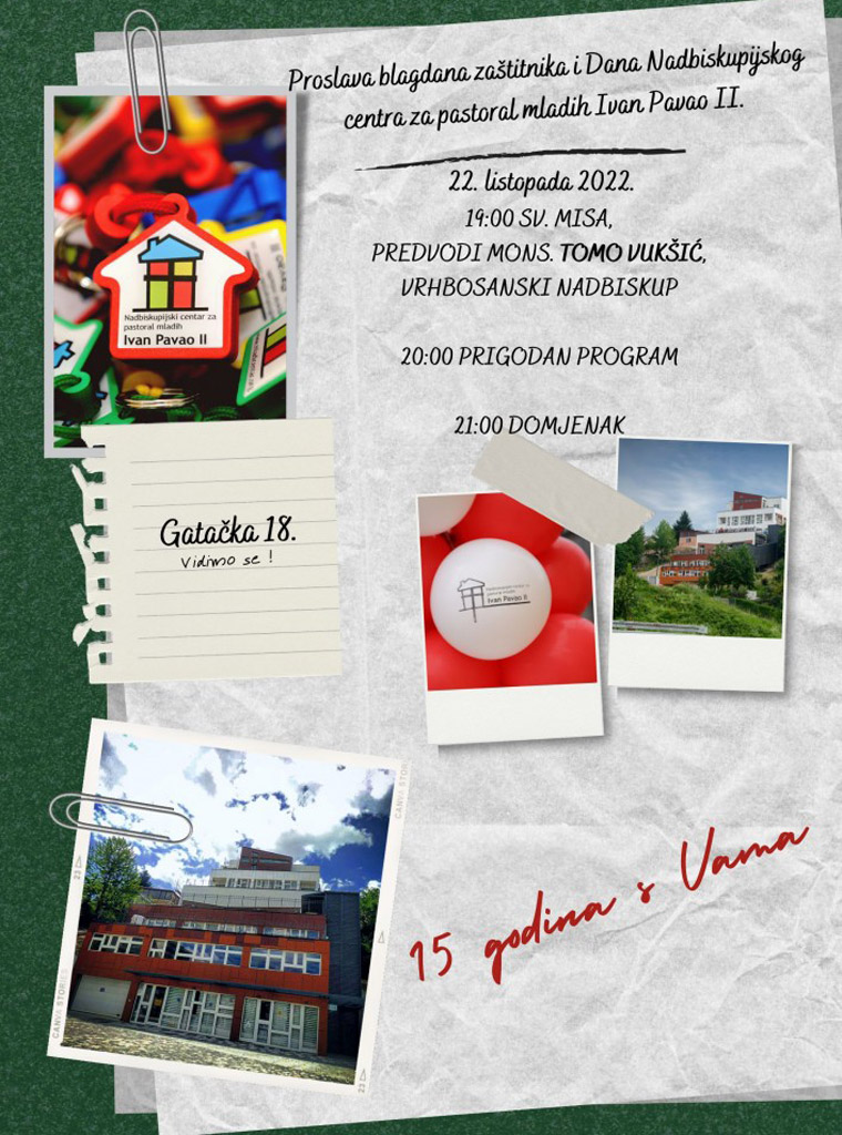 Proslava 15. obljetnice Centra za mlade “Ivan Pavao II.” započet će sv. misom u 19 sati koju će predvoditi vrhbosanski nadbiskup metropolita mons. Tomo Vukšić.