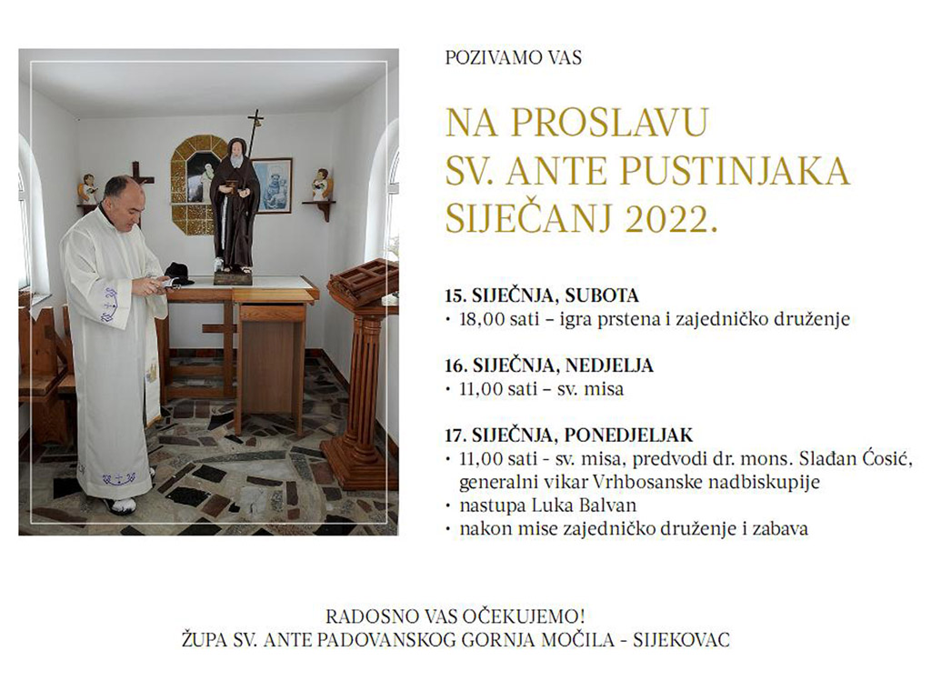 Blagdan Sv. Antuna Pustinjaka bit će proslavljen u ponedjeljak, 17. siječnja, u župi Sv. Antuna Padovanskog u Sijekovcu- Gornjim Močilima u Bosanskoj Posavini.