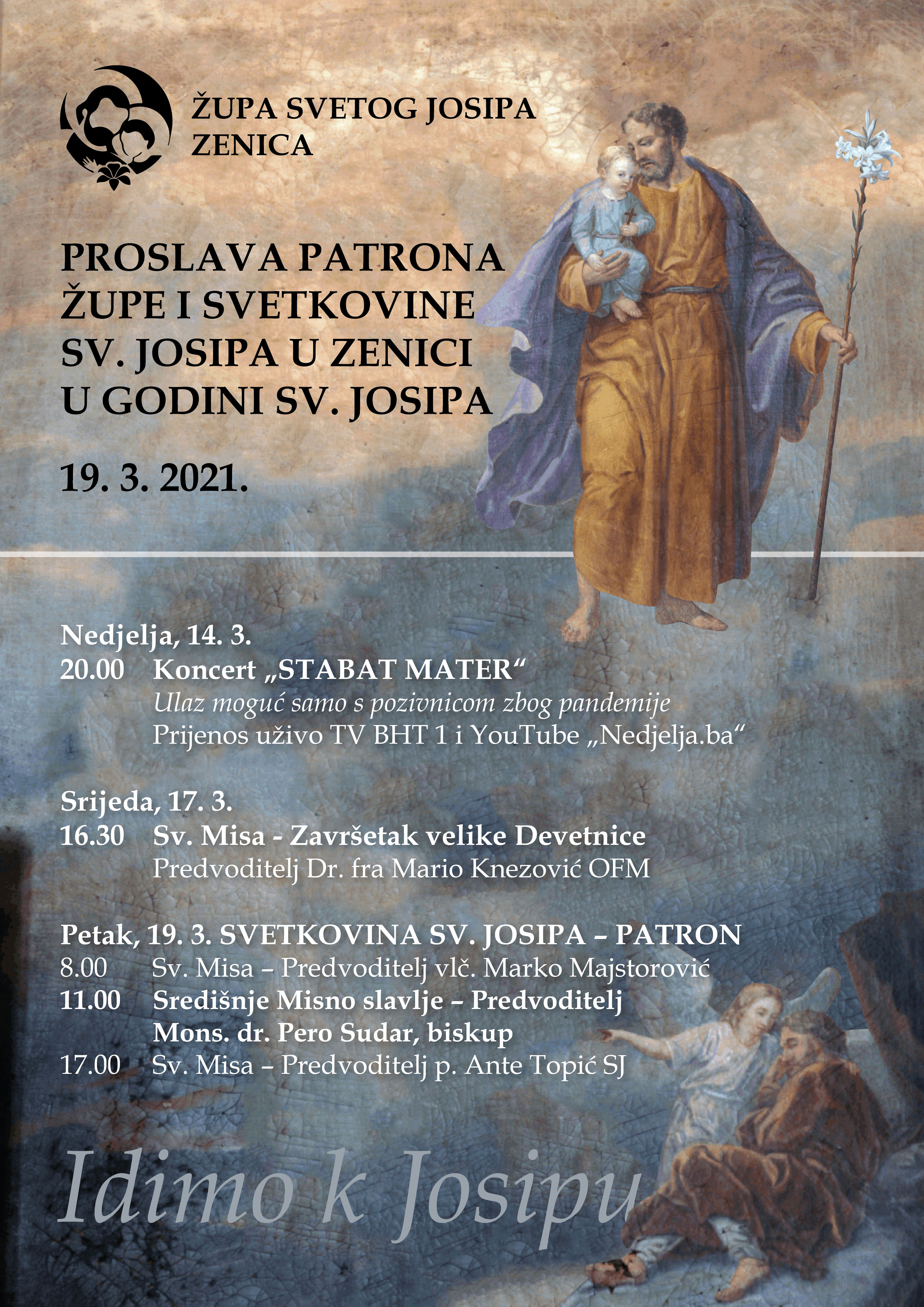 Župa Sv. Josipa u Zenici proslavit će svečano svoj patron u petak, 19. ožujka sv. misama u 8:00, 11:00 i 17:00.