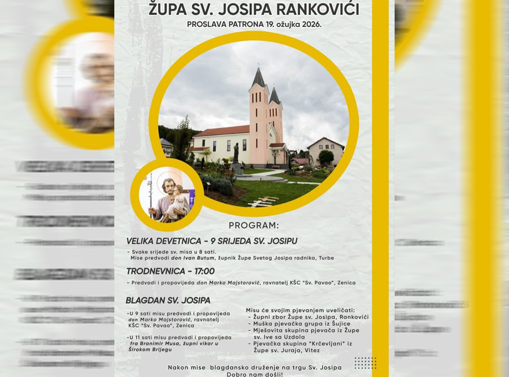 Vjernička zajednica u Rankovićima kod Novog Travnika svečano će 19. ožujka proslaviti svog nebeskog zaštitnika.