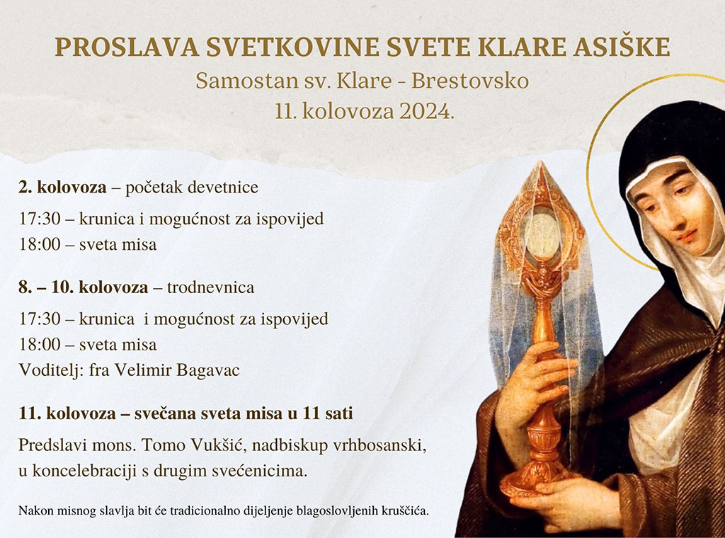 Svetkovina Sv. Klare Asiške slavi se 11. kolovoza te se posebno obilježava u samostanu sestara klarisa na Brestovskom kod Kiseljaka. Donosimo program ovogodišnje proslave.
