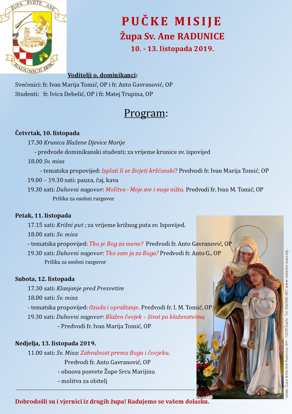 Pripremajući se za proslavu 150 godina župe Svete Ane u Radunicama, bit će upriličene pučke misije. Mjesto održavanja je župna crkva Sv. Ane.