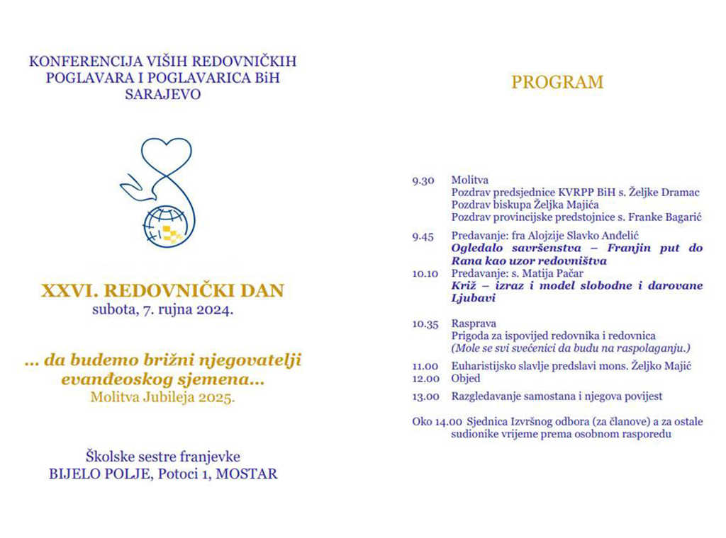 Redovnički dan u Bosni i Hercegovini pod geslom … da budemo brižni njegovatelji evanđeoskog sjemena… (Molitva Jubileja 2025.) održat će se u subotu 7. rujna u samostanu Školskih sestara franjevki Hercegovačke provincije u Bijelom Polju kod Mostara.