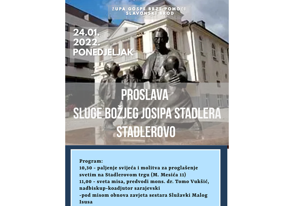 Spomendan rođenja i krštenja Sluge Božjega Josipa Stadlera, prvog vrhbosanskog nadbiskupa - Stadlerovo, proslavlja se ove godine u ponedjeljak 24. siječnja u župi Gospe Brze Pomoći, rodnoj i krsnoj župi velikog sina grada Slavonskog Broda.