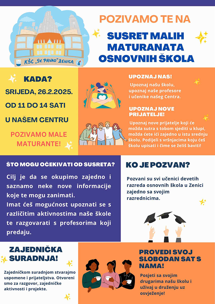 Dana 26. veljače od 11:00 do 14:00 h u prostorijama Katoličkog školskog centra „Sv. Pavao“ u Zenici bit će upriličen susret namijenjen svim učenicima devetih razreda osnovnih škola u Gradu Čelika.