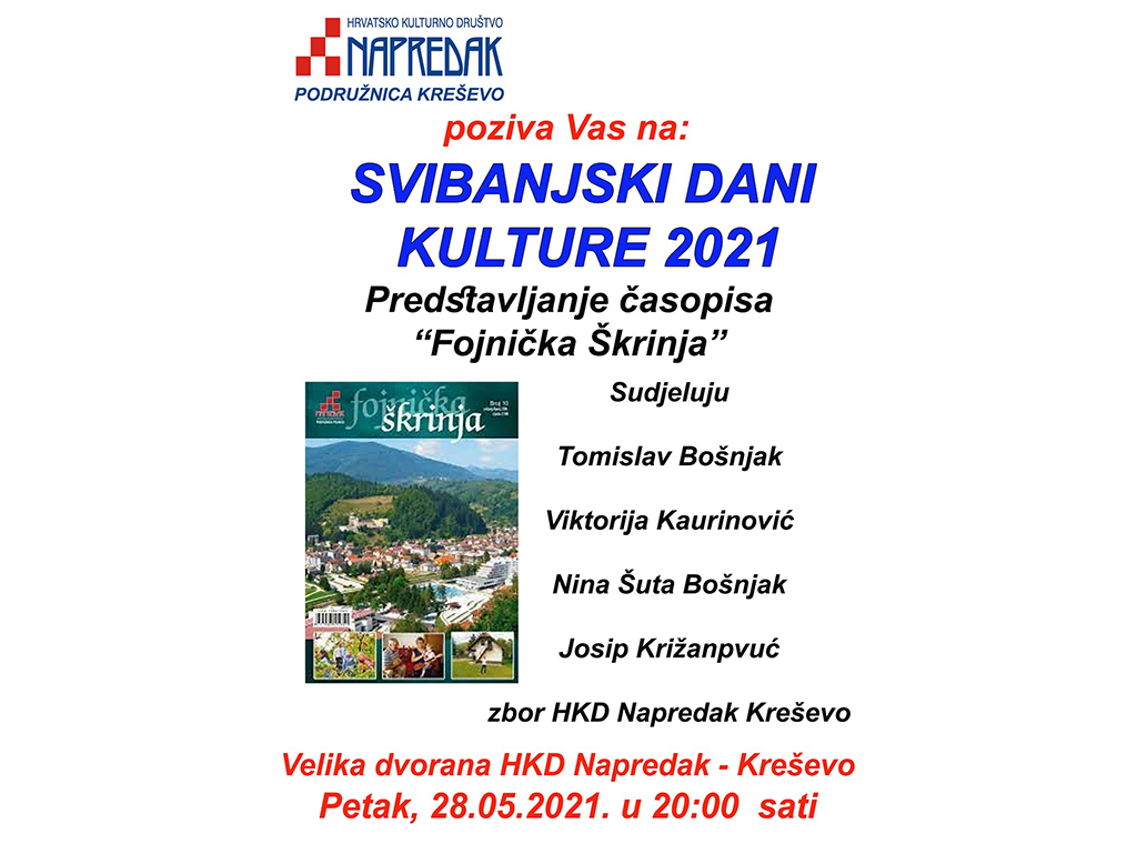 U okviru tradicionalne kulturne manifestacije “Svibanjski dani kulture 2021.” HKD „Napredak“ podružnica Kreševo u petak, 28. svibnja, upriličiti će predstavaljanje časopisa “Fojnička škrinja”.