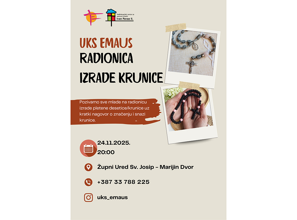 Udruga katoličkih studenata „Emaus“ poziva sve studente i mlade na redoviti susret, koji će se, u obliku kreativne i duhovne radionice, održati u ponedjeljak 24. studenog u 20 sati, u župnom uredu Sv. Josipa na Marijin Dvoru u Sarajevu.