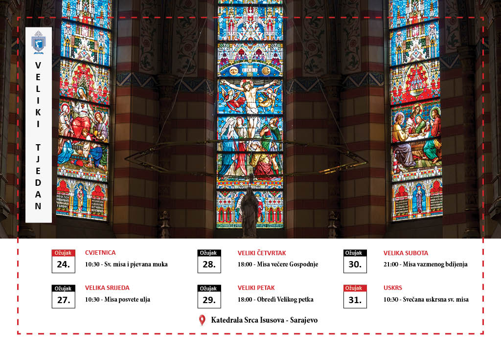 Vrhbosanski nadbiskup metropolita mons. Tomo Vukšić predvodit će obrede Velikog tjedna u sarajevskoj katedrali Srca Isusova. U nastavku donosimo raspored misnih slavlja i obreda u Velikom tjednu te na samu svetkovinu Uskrsa.