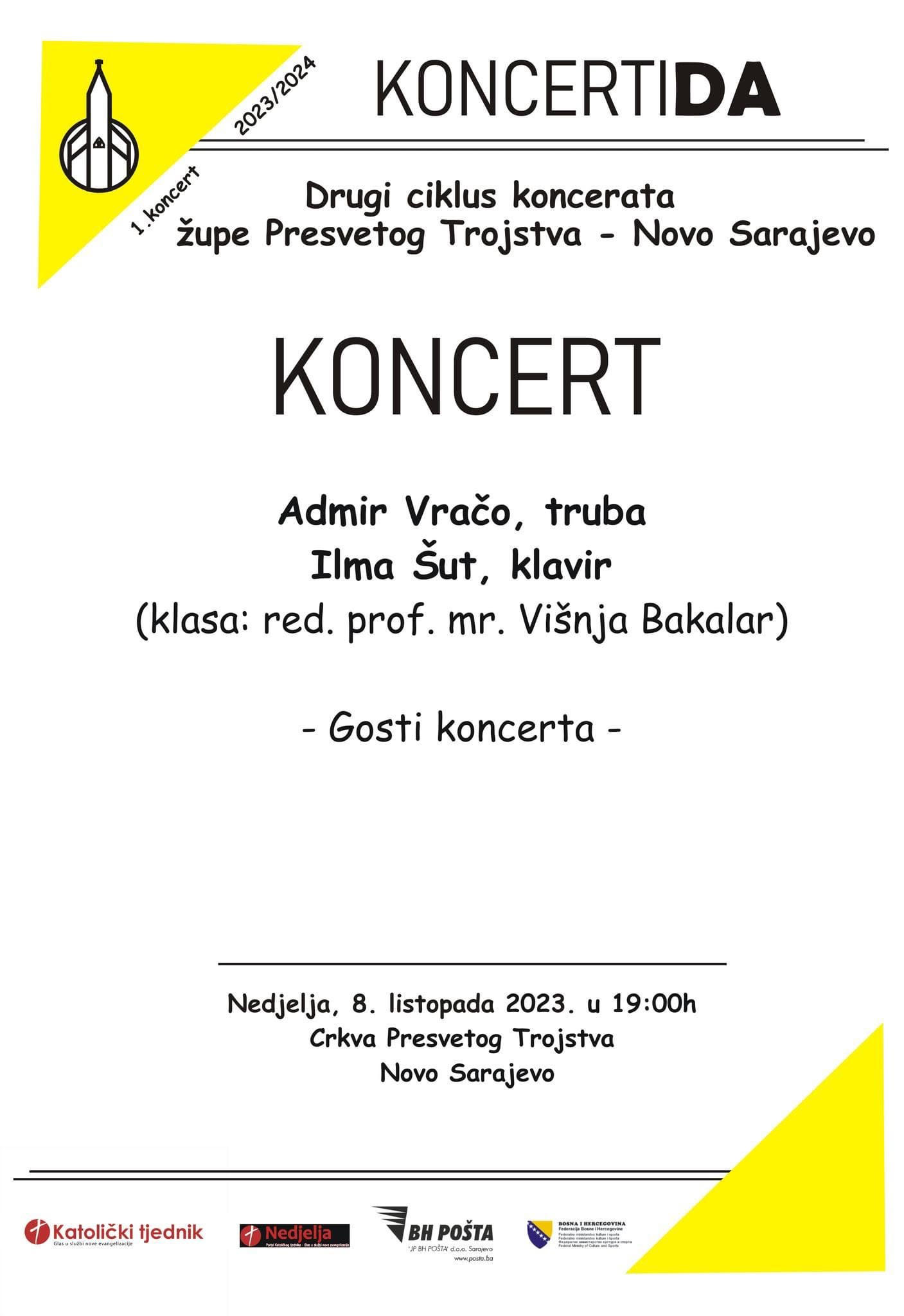 U župi Presvetog Trojstva u Novom Sarajevu u nedjelju, 8. listopada s početkom u 19:00 održat će se koncert na kojemu će nastupiti Admir Vračo na trubi i Ilma Šut na klaviru.