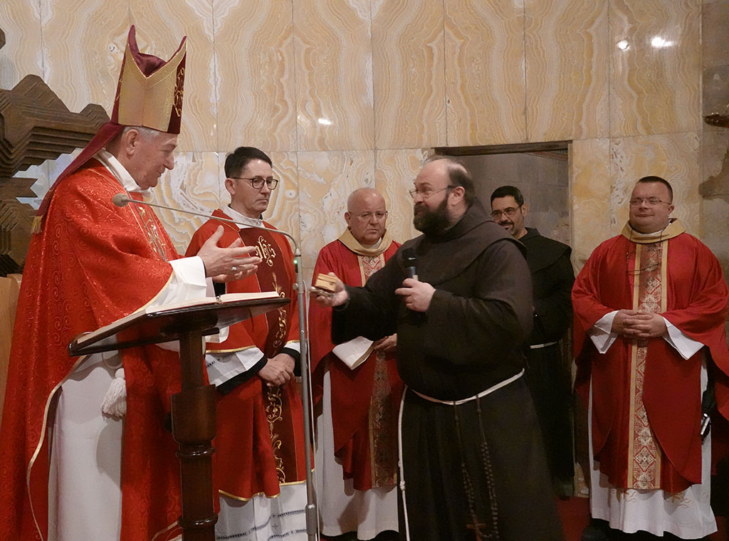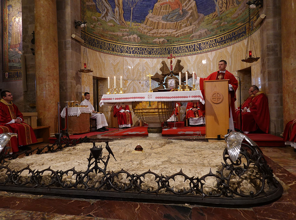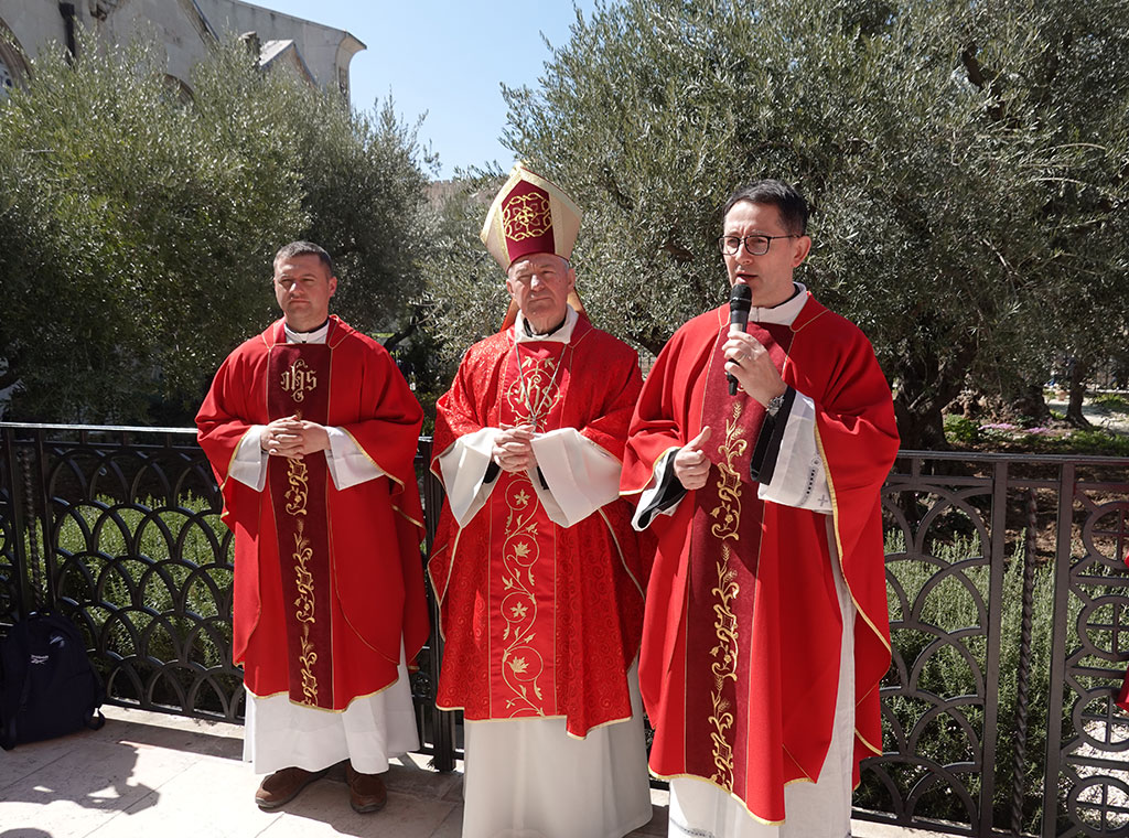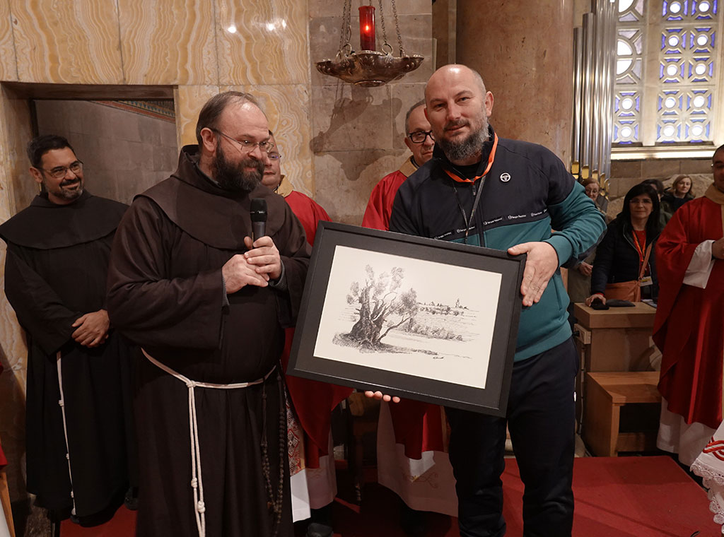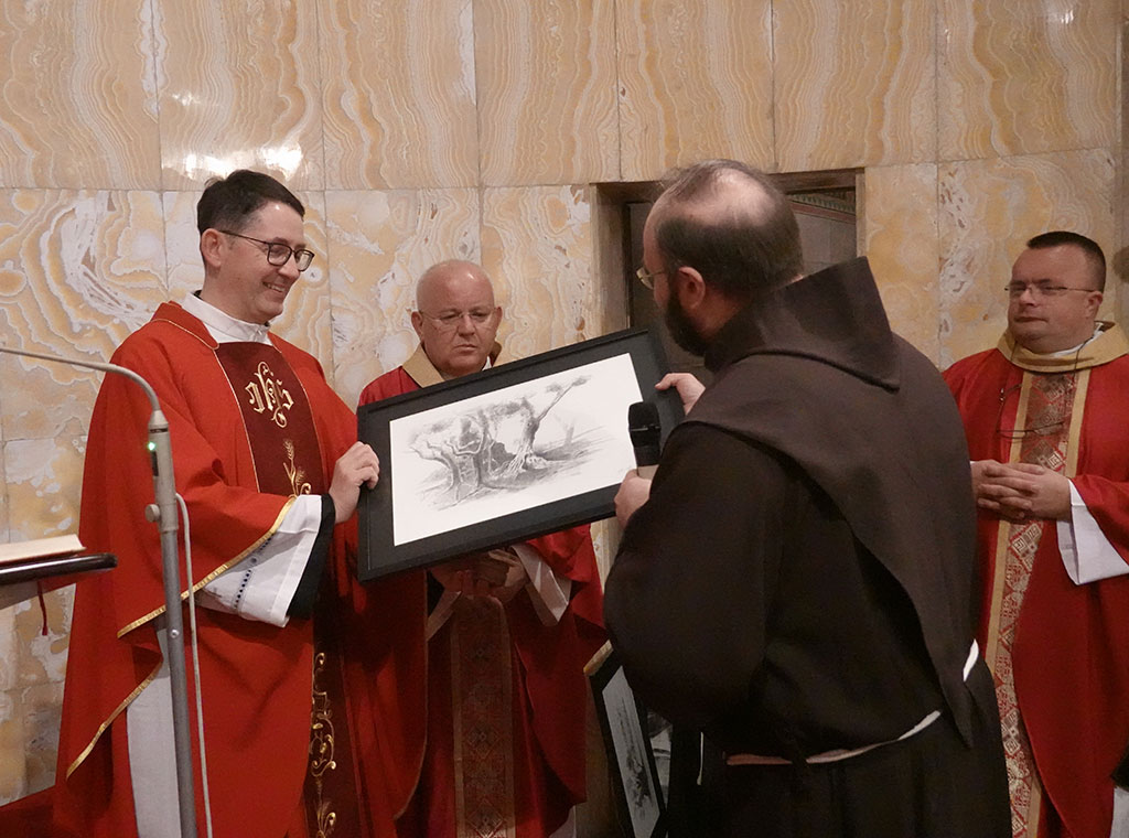 Na završetku mise hodočasnicima se obratio gvardijan getsemanskog franjevačkog samostana fra Siniša Srebrenović poručujući kako Getsemanij u prvom redu uči poslušnosti. Potom je, u ime zajednice sedam zahvalio svima koji su doprinijeli da bude realizirana ideja obilježavanja 100 godina crkve podignute na mjestu Isusove agonije. Na osobit način spomenuo je umirovljenoga nadbiskupa Barišića kojemu je darovao kamen – dio getsemanske stijene i krunicu načinjenu od koštica maslina iz Getsemanskoga vrta. Istu je krunicu darovao i vodiču fra Tomislavu Glavniku, pokretačkoj snazi svih hrvatskih aktivnosti u smislu doprinosa Crkvi i ljudima u Svetoj zemlji; uz to uručio mu je i litografiju Getsemanskog vrta. Na osobit način, uz istu litografiju, izrekao je zahvalu kiparu Iliji Skočibušiću koji je uradio skicu za mozaik „stogodišnjice“, a autor je i uređenja interijera kapele Hrvatskih svetaca i blaženika na Pastirskim poljanama u Betlehemu.