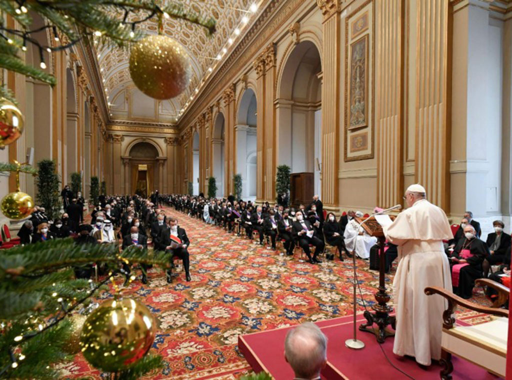 Zahvalio je na sudjelovanju na ovom, kako je rekao, godišnjem „obiteljskom susretu“ veleposlanicima koji predstavljaju 183 zemlje koje imaju diplomatske odnose sa Svetom Stolicom. Osvrnuvši se odmah na pandemiju bolesti COVID-19, spomenuo se nadbiskupa Alde Giordana, apostolskoga nuncija u Venezueli, koji je preminuo u Belgiji, 2. prosinca 2021.