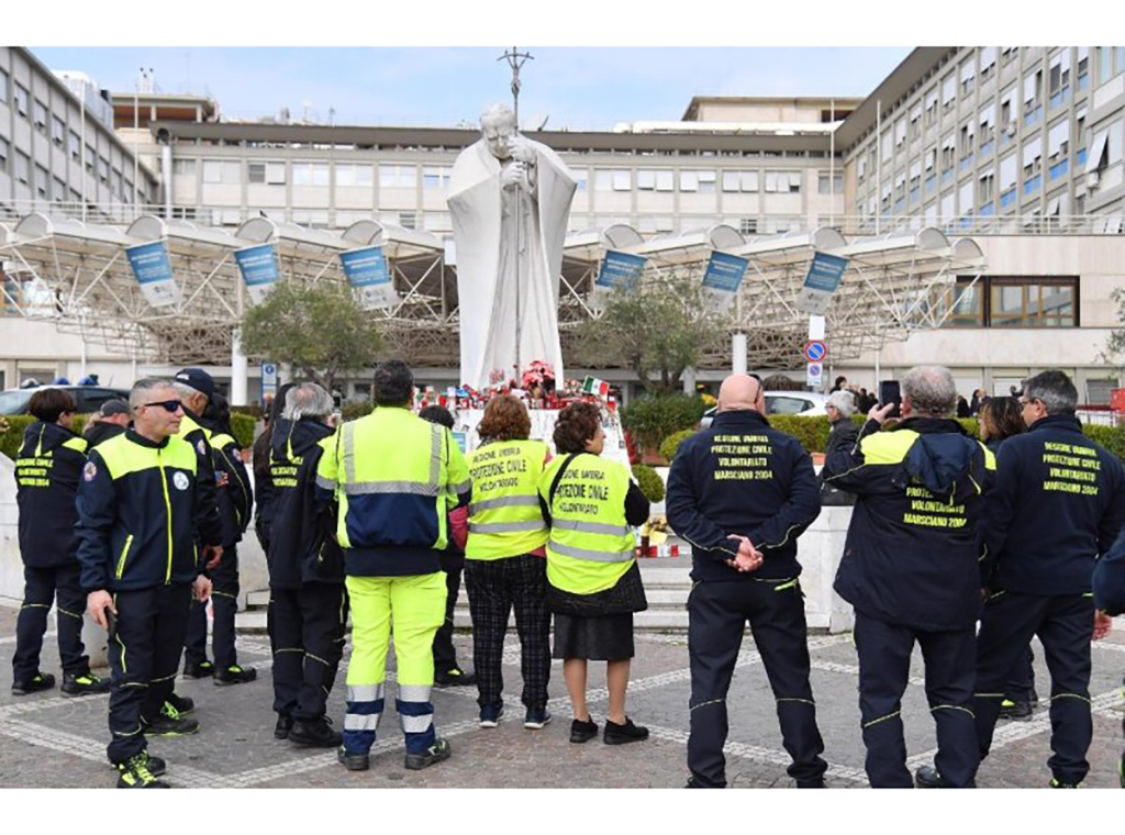 Ispred bolnice Gemelli u Rimu, gdje se papa Franjo oporavlja od obostrane upale pluća, okupili su se i volonteri civilne zaštite. Njihova nazočnost simbolizira podršku i solidarnost s Papom, kao i zahvalnost zdravstvenim djelatnicima koji skrbe za njega.