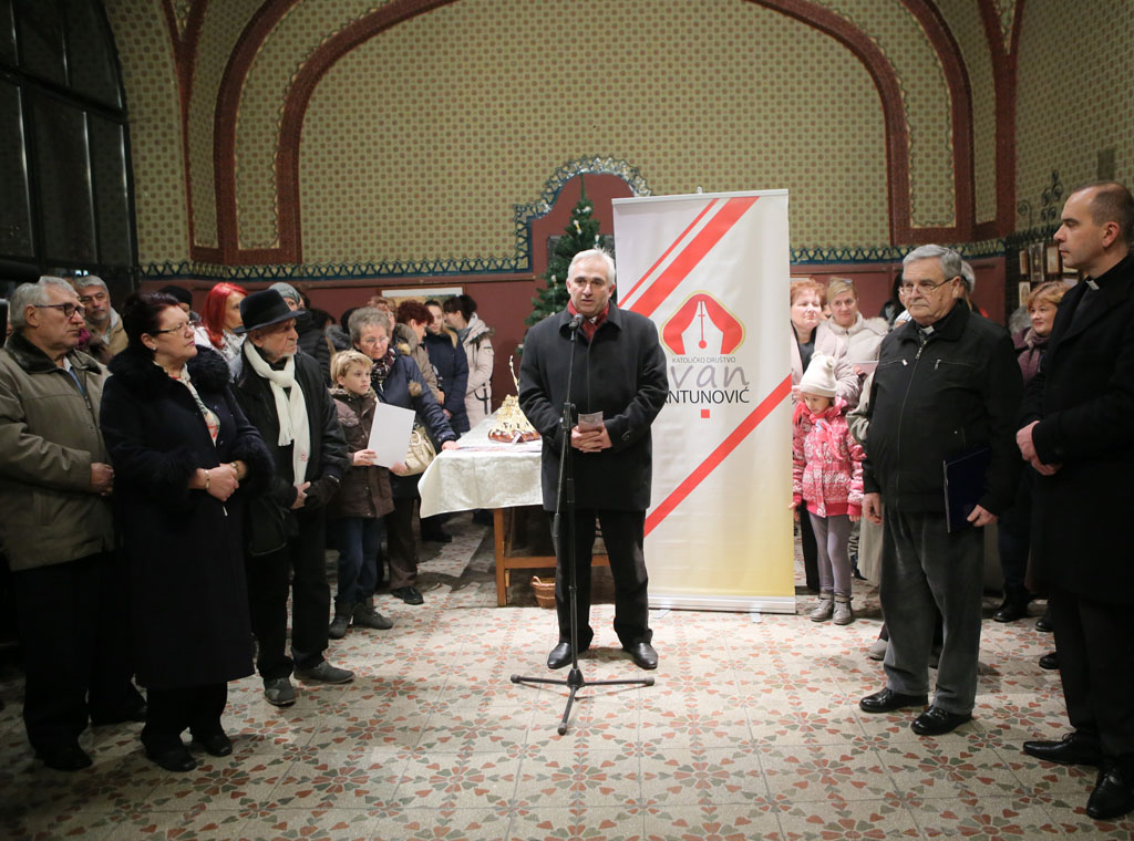 Program je započela ženska pjevačka skupina Prelje HKC Bunjevačko kolo iz Subotice izvođenjem prigodne adventske pjesme Zlatnih krila. Nazočne je pozdravio Lazar Cvijin, potpredsjednik Katoličkog društva Ivan Antunović. U svom obraćanju izrazio je zahvalnost svima onima koji sudjeluju u organiziranju izložbe božićnjaka, kao i udrugama s kojima Katoličko društvo Ivan Antunović surađuje na izložbi božićnjaka.