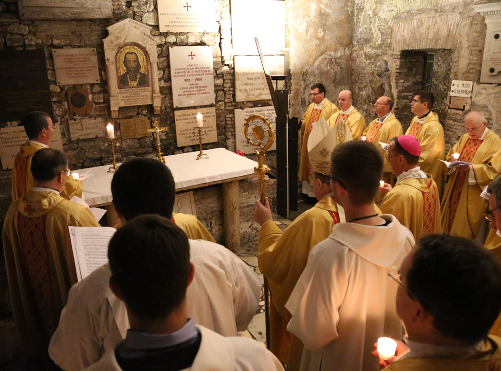 Na svečanom euharistijskom slavlju u Bazilici Sv. Klementa, gdje je pokopan Sv. Ćiril, koncelebrirali su mons. Giampiero Gloder, predsjednik Papinske crkvene akademije; mons. Marin Srakić, đakovačko-osječki nadbiskup u miru te 80-ak svećenika.