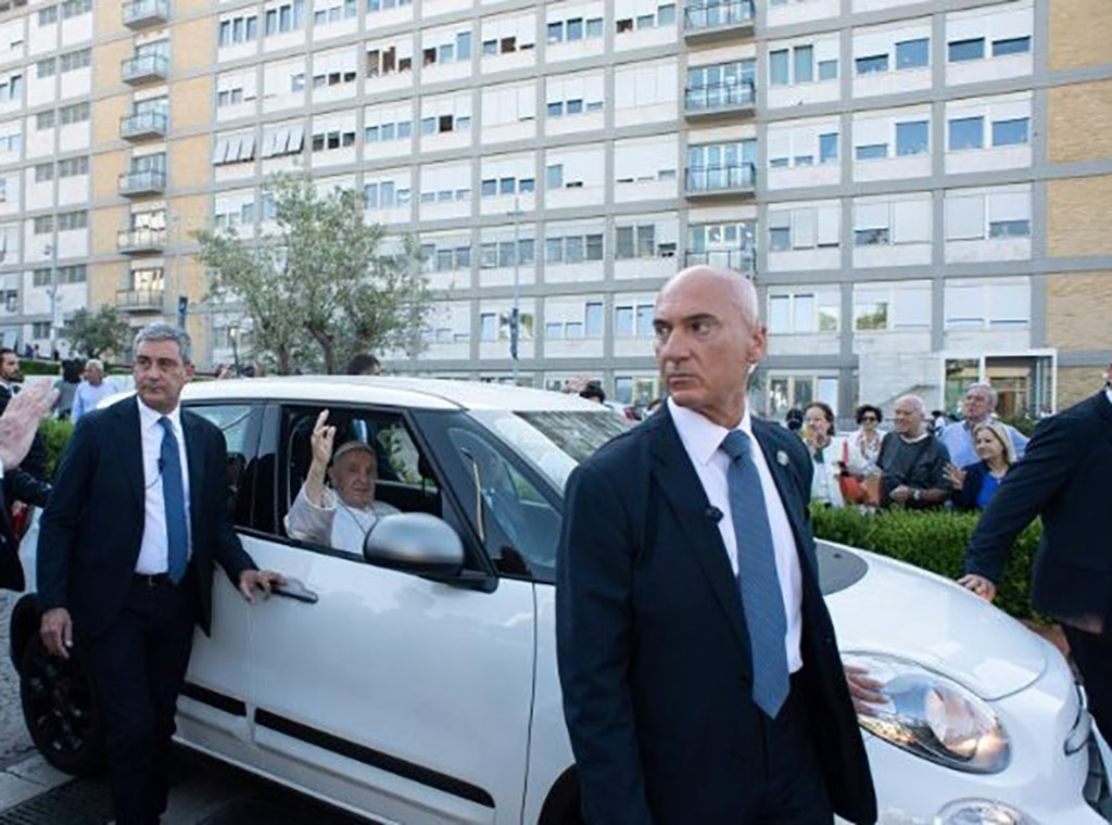 Nakon izlaska iz bolnice pomolio se u bazilici Santa Maria Maggiore, a prethodno je posjetio redovnice Instituta Maria Santissima Bambina, u blizini Vatikana. Ispred Vrata Perugino, pozdravio je službenike za provođenje zakona i zahvalio im na njihovoj službi