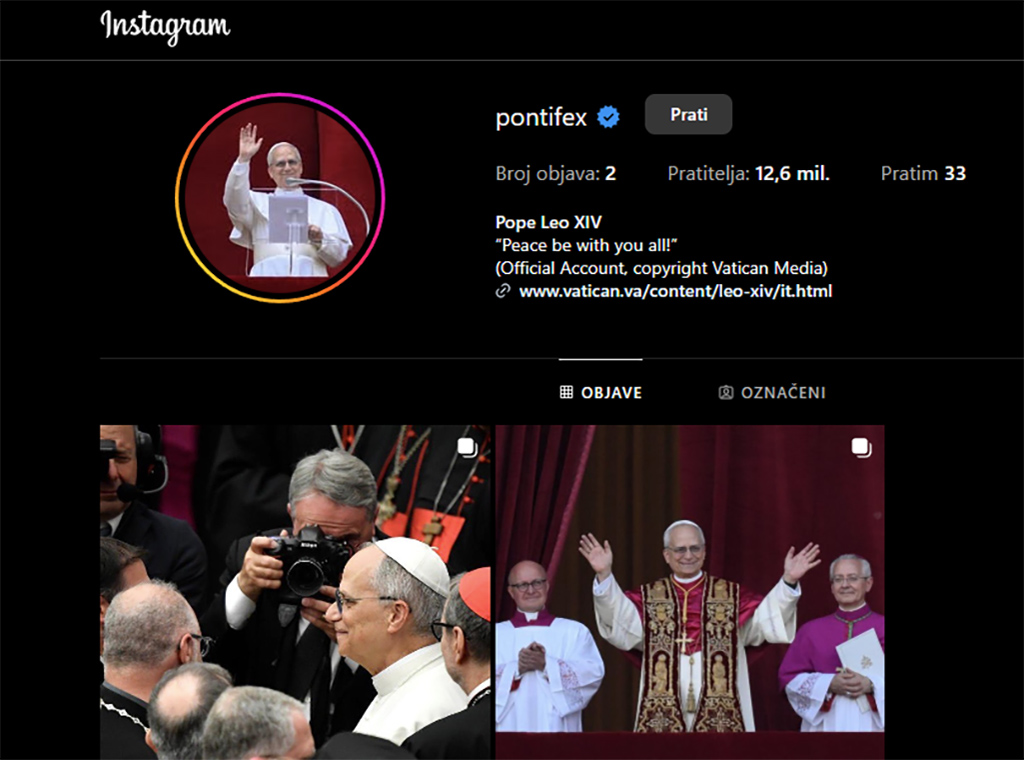 „Na Instagramu se novi papin račun zove @Pontifex – Pope Leo XIV i jedini je službeni račun Svetog Oca na ovoj platformi u kontinuitetu s računom pape Franje, @Franciscus“, istaknuto je u izjavi uz objašnjenje kako će sadržaj koji je papa Franjo objavio na X „uskoro biti arhiviran u odgovarajućem odjeljku institucionalne mrežne stranice Svete Stolice, Vatican.va“.