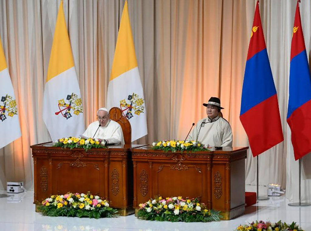 Obraćajući se civilnim vlastima u Ulaanbataaru, 2. rujna, papa Franjo pohvalio je aktivnu ulogu Mongolije u promicanju svjetskog mira i istaknuo doprinos male mongolske Katoličke Crkve izgradnji prosperitetnog društva u zemlji.
