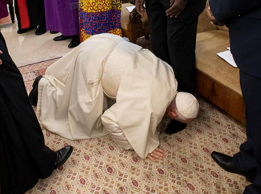 Tom prilikom je neočekivano i izvan protokola poljubio stopala predsjedniku Salvi Kiiru Mayarditu i bivšem vođi pobunjenika i potpredsjedniku Rieku Macharu, Rebecci Nyandeng De Mabio, kao i još nekim sudionicima toga duhovnoga i diplomatskoga susreta, preklinjujući ih da prestanu s ratom u toj zemlji.