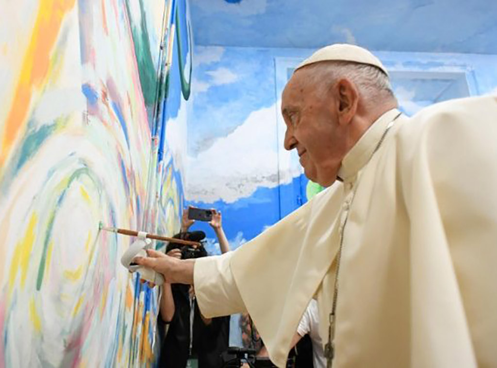 Nakon što mu je uručen "kist", Papa je dodao završnu gestu Scholasovom muralu, naslikavši kružni potez zelenom bojom koji se besprijekorno uklopio u cjelinu.