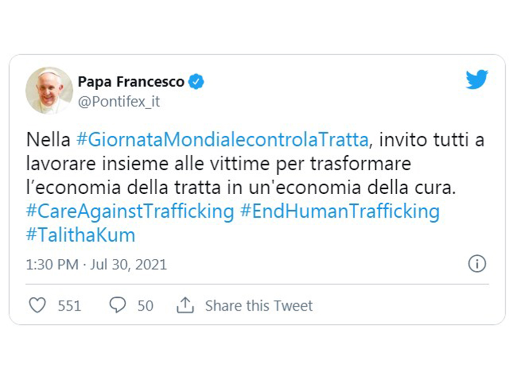 U poruci na društvenoj mreži „Twitteru“ od 30. srpnja papa Franjo pozvao je na borbu protiv trgovine ljudima.