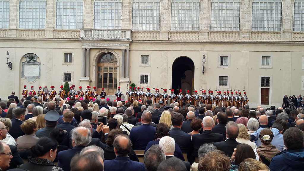 U nazočnosti svojih obitelji, diplomatskog zbora, nekoliko kardinala i biskupa držeći lijevom rukom zastavu, a desnom podižući tri prsta u znak Presvetog Trojstva, novi gardisti su prisegnuli na vjerno, odano i časno služenje Papi.