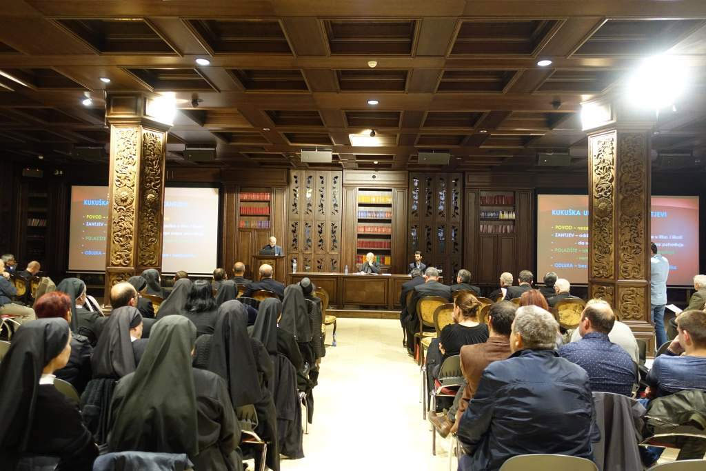 Kanonski i pravni položaj Katoličke Crkve u Makedoniji od 1914. do 2018. godine naziv je predavanja koje održao biskup Vukšić s KBF-a u Sarajevu. Osvrnuo se kako je na početku 20. stoljeća Makedonija bila u sastavnu Otomanskoga carstva i obuhvaćala mnogo veće područje nego današnja država. Katolička Crkva u toj Makedoniji bila je organizirana u rimokatoličku Skopsku nadbiskupiju sa sjedištem u Prizrenu, grkokatolički Apostolski vikarijat sa sjedištem u Solunu i rimokatolički Apostolski vikarijat sa sjedištem u Carigradu. Pravni položaj Crkve u Makedoniji kroz proteklih nešto više od 100 godina regulirale su četiri vrste propisa. Prije svega, bili su primjenjivani opći crkveni propisi, sadržani najprije u Zakoniku kanonskoga prava iz 1917. i kasnije u onom iz 1983. te Zakoniku kanona istočnih Crkava iz 1995. Druga vrsta su mješoviti crkveno-državni propisi konkordatske naravi, a proizlazili su iz ugovora, koje je Sveta Stolica sklapala s pojedinim državama. Treći su dokumenti u obliku dekreta, konstitucija, apostolskih pisama i reskripata, koje je Sveta povremeno izdavala. A četvrta vrsta su zakoni o vjerskim zajednicama, što su ih izdavale državne vlasti, koje su upravljale ovim područjem. Nakon balkanskih ratova Srbija je zauzela velik dio Makedonije, koji je prozvan Južna Srbija. A kad je Kraljevina Srbija 1914. sklopila konkordat sa Svetom Stolicom, Skopska nadbiskupija je proglašena biskupijom, sufraganskom u Beogradskoj crkvenoj pokrajini, i obuhvaćala je cijelo područje na koje se Srbija prethodno proširila. Poslije nastanka Jugoslavije Sveta Stolica je Skopskoj biskupiji pripojila i dijelove carigradskog Apostolskog vikarijata oko Bitole. Istovremeno, grkokatolike solunskog Apostolskog vikarijata, koji su se našli u Jugoslaviji, Sveta Stolica pripojila je Križevačkoj eparhiji. Kraljevina Jugoslavija je naslijedila četiri različita konkordata, koje je Sveta Stolica u prethodnom razdoblju sklopila s tri različite države (Austrougarska, Crna Gora, Srbija), od kojih ni jedna nije više postojala. Međutim, državna vlast je dugo odbijala riješiti pravni položaj Katoličke Crkve, uključujući katolike u Makedoniji. Takvo stanje trajalo je sve do 1935. Tada je sklopljen konkordat sa Svetom Stolicom, ali taj konkordat, zbog otpora politike i Srpske Pravoslavne Crkve, ustvari nikada nije stupio na snagu. U vrijeme socijalističke Jugoslavije odnose Crkve i države ravnao je dugo samo vrlo restriktivan i neprijateljski savezni zakon o vjerskim zajednicama. Kasnije je i svaka republika, pa i Makedonija, imala svoj zakon za vjersko pitanje, jednako ideološki obojen i protivan Crkvi. Za Katoličku Crkvu određeno značenje imao je i Protokol, koji su 1966. potpisali Sveta Stolica i Jugoslavija. Malo nakon toga (1969.) Sveta Stolica je odredila, da područja u Crnoj Gori, koja su pripadala Skopskoj biskupiji, uđu u sastav Barske nadbiskupije, i da Skopska biskupija bude „ad instar et ad tempus“ sufragan Sarajevske metropolije. Samostalna Makedonija nije potpisala ugovor sa Svetom Stolicom, a odnose Crkve i države regulira zakon o vjerskim zajednicama. Teritorij Skopske biskupije, ustanovljenjem Prizrenske apostolske administrature (2000.), sveden je na područje države Makedonije, a Biskupija nastavlja biti sufragan Sarajeva. Izuzeta je iz nadležnosti Kongregacije za širenje vjere (2006.) te podložena Državnom tajništvu i članica je Međunarodne biskupske konferencije Sv. Ćirila i Metodija. Grkokatolici su najprije dobili Apostolski egzarhat (2001.), a 2018. Strumičko-Skopsku eparhiju, koja nije član ni jedne biskupske konferencije i izravno je podložna Svetoj Stolici, a biskupija i eparhija imaju istu osobu za dijecezanskoga biskupa. Na kraju studije nalazi se cjelovit tekst 15 ključnih dokumenata, crkvenih i državnih, koji su ravnali životom Crkve u Makedoniji kroz proteklih stotinu godina. Iako su svi zajedno naslovljeni kao „dodatak“, oni su sastavni dio ovoga prikaza, jer studija često upućuje čitatelja, da će tek u njima naći sve detalje, koji ga budu zanimali.