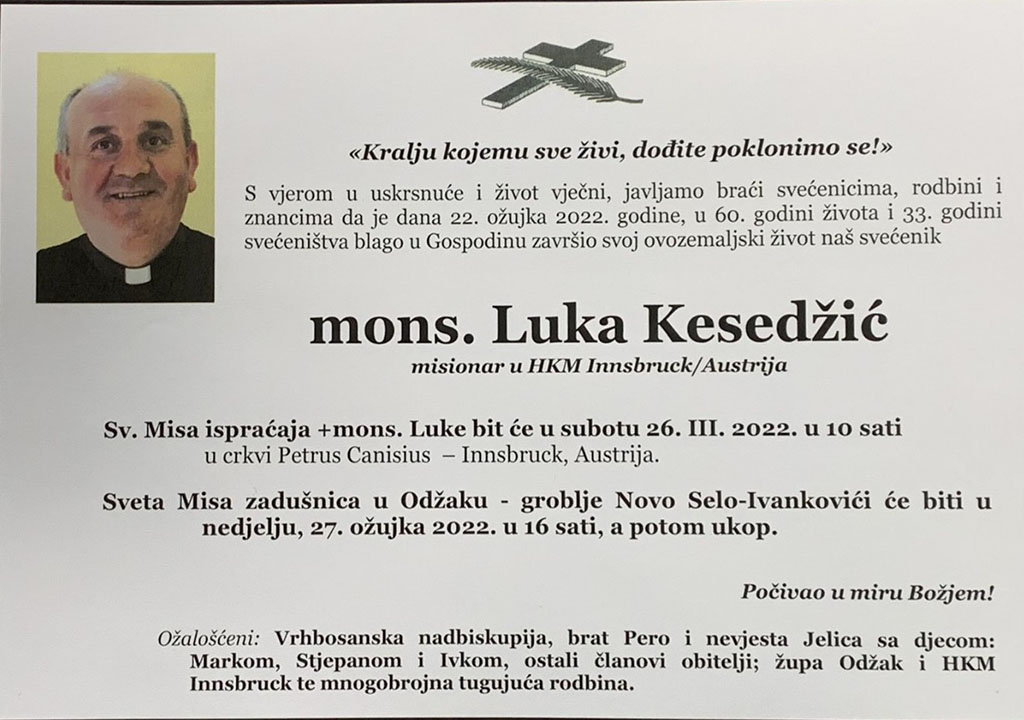 U večernjim satima u utorak, 22. ožujka u Innsbrucku u 60. godini života preminuo je mons. Luka Kesedžić, svećenik Vrhbosanske nadbiskupije i voditelj Hrvatske katoličke misije u spomenutome austrijskom gradu.