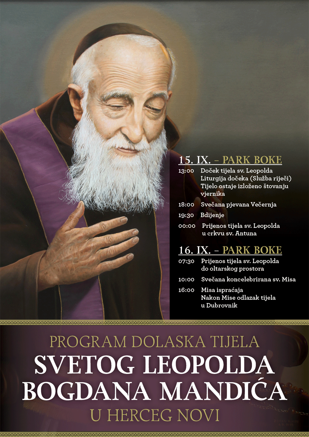 „S velikom radošću iščekujemo dolazak relikvije tijela Sv. Leopolda u njegov rodni grad, Herceg Novi, 15. i 16. 9. 2017. godine. Radujemo se, također, vašem dolasku i sudjelovanju u molitvenim i liturgijskim točkama programa. Pojedine točke tog programa možete naći i na priloženom plakatu“, objavio je danas Odbor za organizaciju dočeka tijela sv. Leopolda Bogdana Mandića.