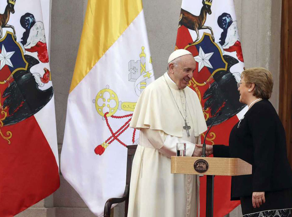 Također u jutarnjim satima 16. siječnja, papa Franjo je započeo svoj posjet ovoj južnoameričkoj državi susretom s predsjednicom Michelle Bachelet, predstavnicima političkog i društvenog života te s diplomatskim zborom. Odmah na početku svog govora progovorio je o skandalu zlostavljanja istaknuvši kako je on ugrozio vjerodostojnost tamošnje Katoličke Crkve te bacio sjenu na njegov dolazak, koji je ujedno prvi u posljednja tri desetljeća.