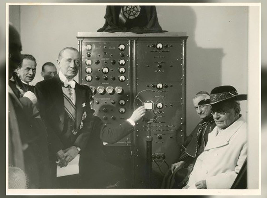 Prvi glas 12. veljače 1931. koji je progovorio kroz mikrofone Statio Radiophonica Vaticana bio je glas znanstvenika Guglielma Marconija kojem je papa Pio XI. povjerio zadatak projektiranja i izgradnje ovog izvanrednog instrumenta komunikacije, a isusovcima je povjerio upravljanje njime.