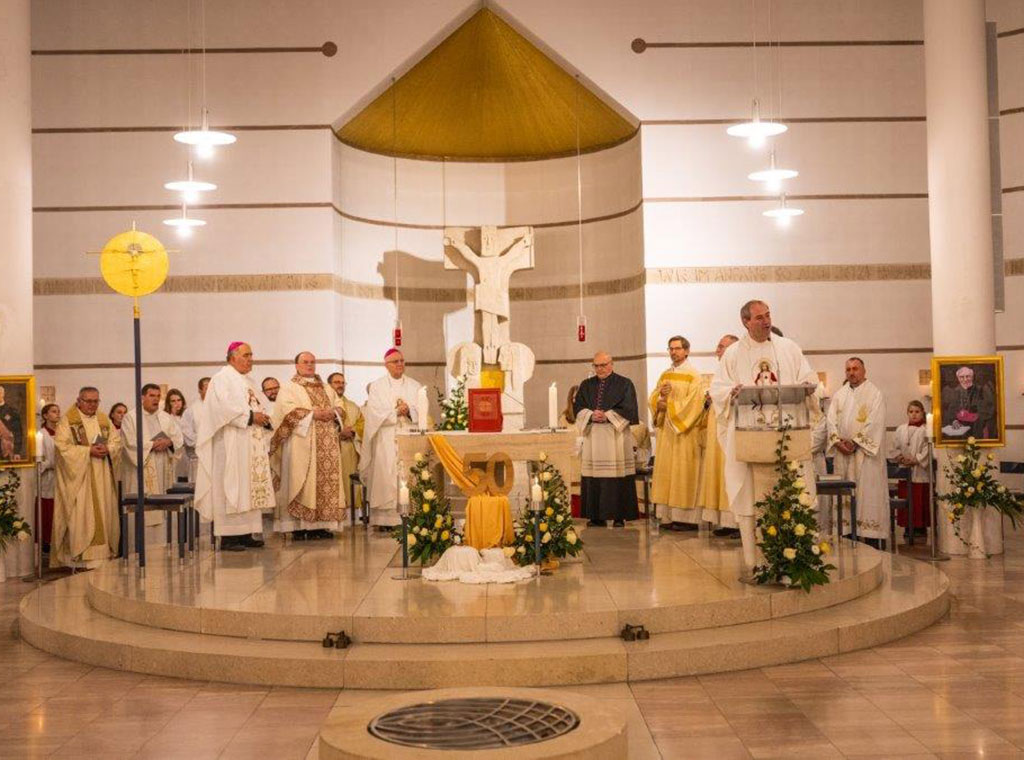 Obilježavanje jubileja započelo je svečanim euharistijskim slavljem u župnoj crkvi Maria unterm Kreuz (Marija pod križem), a predvodio ga je biskup Augsburga mons. Bertram Meier, u zajedništvu s banjalučkim biskupom mons. Franjom Komaricom te kotorskim biskupom u miru mons. Ilijom Janjićem. Koncelebrirala su šestorica svećenika hrvatskog govornog područja te 15 njemačkih svećenika.