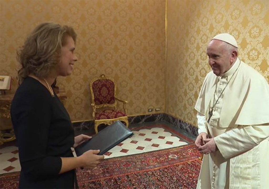 Dr. Valkenburg-Roelofs obratila se Svetom Ocu na španjolskom te mu je predala vjerodajnice. Papa je, pak, novoj veleposlanici poklonio dokumente izdane za njegova pontifikata, izvijestio je Tiskovni ured Svete Stolice.