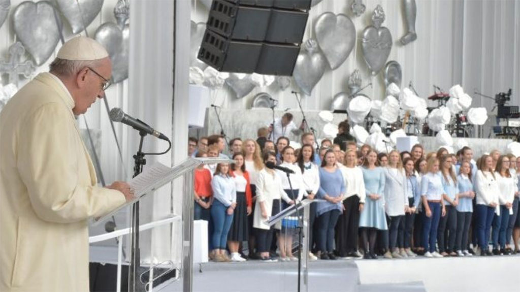 Prije blagoslova, papa Franjo je nadbiskupu Vilniusa Gintarasu Grušasu predao poklon kalež, a potom su mladi pjesmom izrekli molitvu za Papu. Na kraju susreta je svima udijelio svoj blagoslov. Sveti Otac je potom pohodio katedralu, te je pred kip Gospe Sibirske položio cvijeće i zadržao se u kratkoj molitvi.